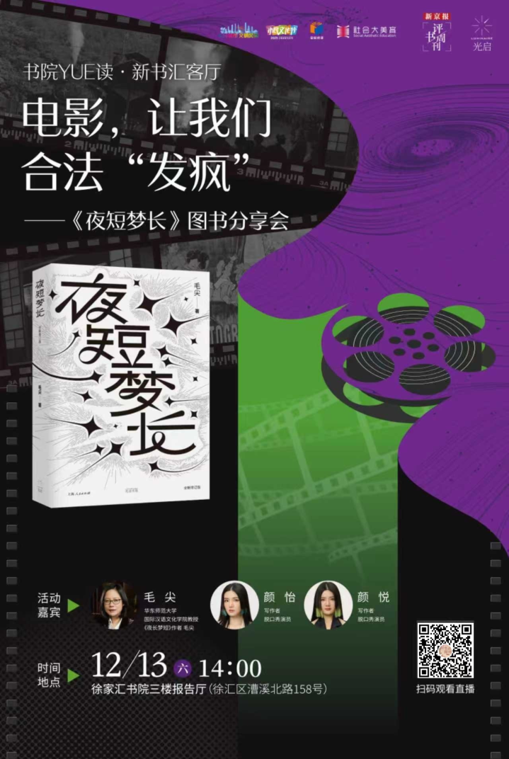12月13日(周六)14:00,新京报书评周刊联合光启书局,在徐家汇书院攒了一个“发疯局”,邀请影评人、作家毛尖,带着全新增订版的《夜短梦长》,和脱口秀演员、写作者颜怡&颜悦一起,细数各类喜剧,给银幕“二货”分级,吐槽辣眼烂片。让我们在电影和段子里,合法地发疯。